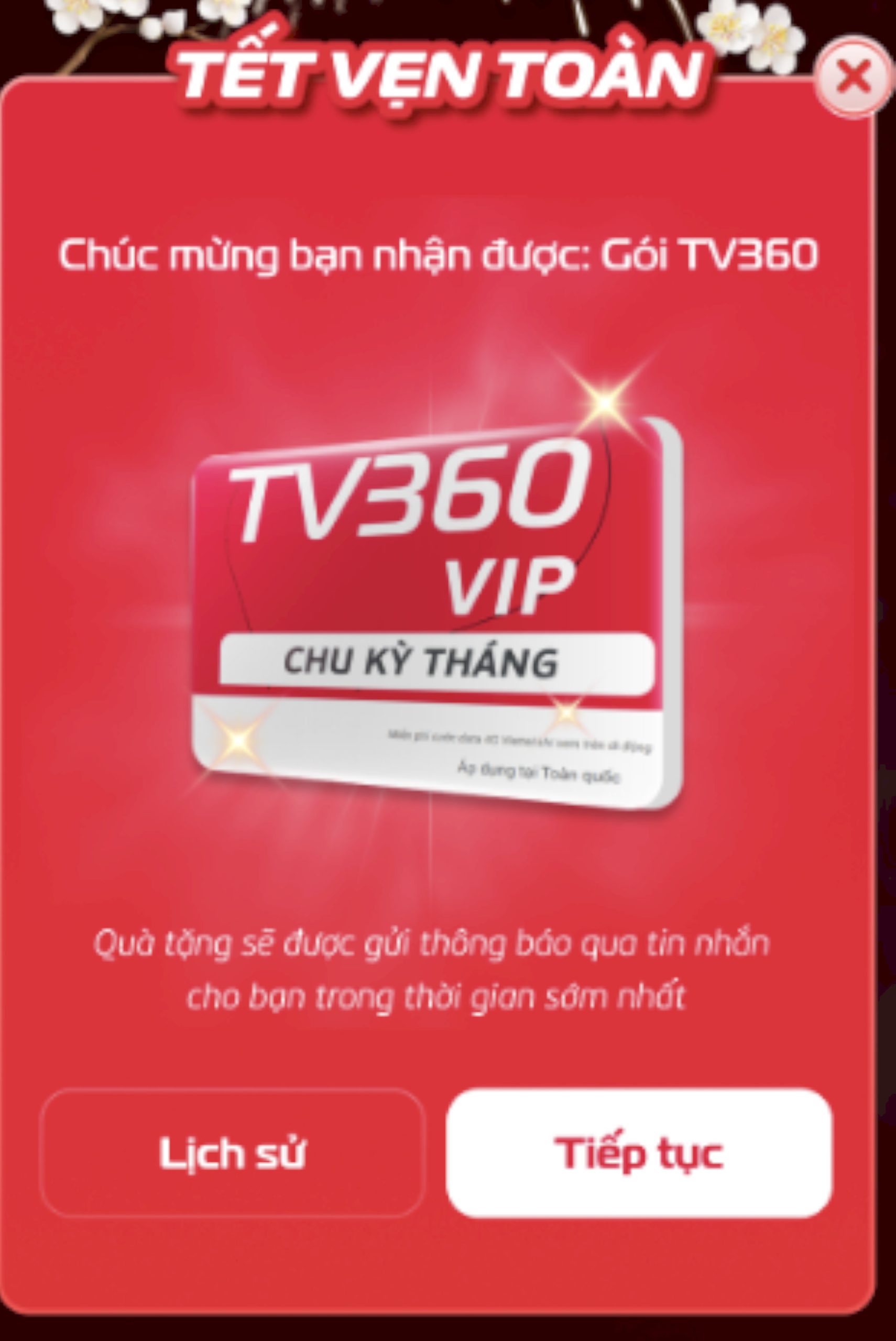 • Đối với quà tặng là gói truyền hình TV360 (gói cước VIP): gán gói trực tiếp vào thuê bao của khách hàng (tối đa trong vòng 48h kể từ thời điểm nhận được thông báo trúng thưởng).
